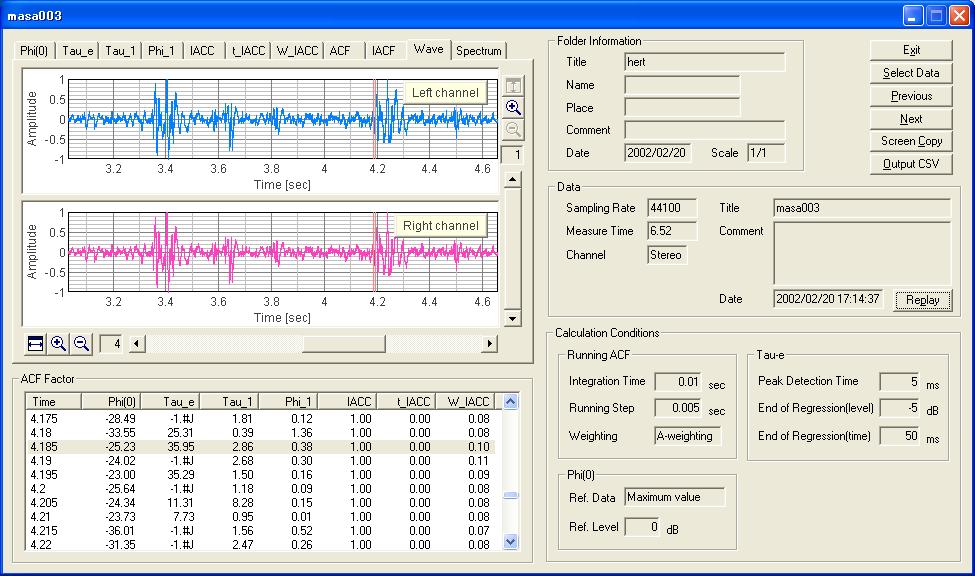 計算が終了して、その分析結果をクリックして表示させたところです。今回はモノラルですから、Φ(0) 音量、τe ACFの有効成分の持続時間、τ1 基本周波数ピッチ、φ1 ピッチの強さと ACFを調べることになります。その他のものは2ch 計測時のチャンネル間の相互相関の関係のデータ分析だからです。
