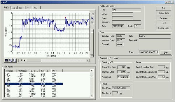 この段階で、他の音響パラメーターのτ1や、φ1やτeや、もともとの、特徴点この場合は音圧レベルの特徴的なピークのポイントでのACFのグラフを組み合わせ画像として作ってみました。