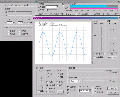 Lchのみの出力を入力ポートのプローブにつなぎ、それをテスターの電圧計(V)で測定します。ところがそのままではゲインが小さいのか、波形が正常に表示されません。