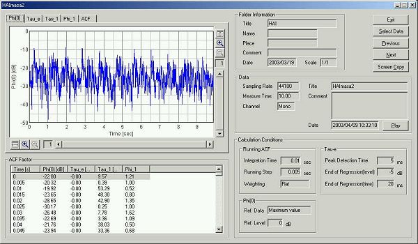 Time course of the acoustical parameters calculated from the ACF are shown below. This graph image is created by clicking the "Screen Copy" button.