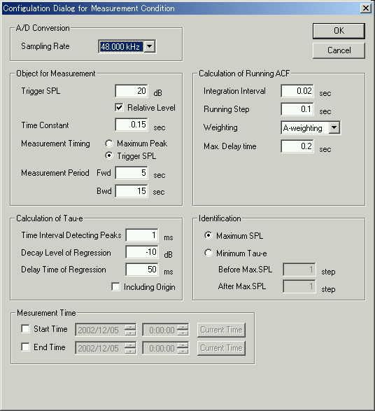 Detailed explanation of a setup of the Running ACF is omitted here. See the program manual. Integration interval is set as 0.02 sec. This is for capturing the change of the sound pressure level precisely. Identification timing was set as Maximum SPL tentatively.