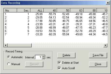 | Channel | In the case of stereo measurement, left channel's data is displayed by checking "L ch" radio button, and right channel's data is displayed by checking "R ch" radio button. (Left channel's data is displayed in light blue, and right channel's one is pink.) In the case of monaural measurement, only left channel is displayed. | |