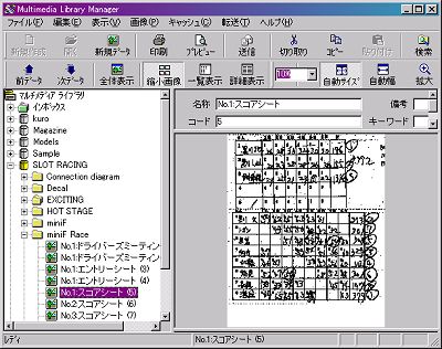 わたしはいま月に一度、スロットレーシングのレースを主催しています。全長20cmくらいの模型自動車を、中央に溝のある専用コース上で走らせる他愛ない遊びです。子供から大人までいっしょに、1回5分のレースを6回行なって、コースを何周することができたかを競っています。きわめて単純な遊びなのですが、カーブでスピードを出しすぎるとコースから飛び出してしまうのでうまくコントロールしなければなりません。 レースを3回、4回と回を重ねてきたので「そろそろ成績を集計しようかな」と思ったら「あれ、ないぞ」。成績表は手書きですからコピーはありません。「おかしいなぁ。たしかクリアフォルダーに入れたはずなんだけど」。そのフォルダーが見つかりません。(ありがち) 数日後ようやく発見。「探し回るなんて時間の無駄だ。よし、全部パソコンに取り込むぞ!」というわけで、愛機 VAIOにEPSONのスキャナーGT7000をつないで「MMLIB」を立ち上げました。 |