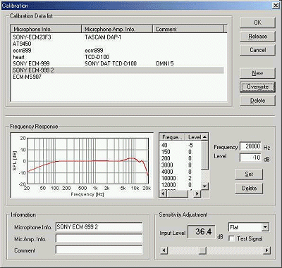 この例は、SONYのECM-999を正確にマイク校正を行っている例です。そのわけは、スピーカーの周波数特性を測定しようとしているからです。そのため、マイクにメーカーで測定した周波数特性表がついた、高級なマイク(数万円)を使用しています。このマイクは生録用では最高級で、低音から高音まで、音の描写が際立っています。もちろん低域から、高域まで広いダイナミックレンジも持っています。また特性表がついているので、これを使用して1/3オクターブ分析すれば、理論的にはほぼ正確な測定が出来ます。