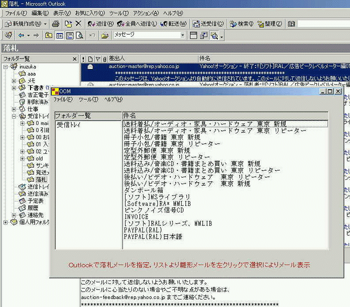 「OCM」は簡単で便利なソフトです。Yahoo!オークションに便利です。 下の例はYahoo!オークションでの模型自動車ボディの落札終了メールです。最初の「おめでとうございます」の文章で落札メールと判断しています。このメールのYahoo!の落札情報のURLアドレスから、インターネットにアクセスして、落札者のメールアドレスなどの情報を自動取得します。ここでは、メールを選択してサンキュメールのテンプレートを選択して、「メール作成」ボタンを押すことだけです。「OCD」の例ですが「メール作成」機能は同じです。